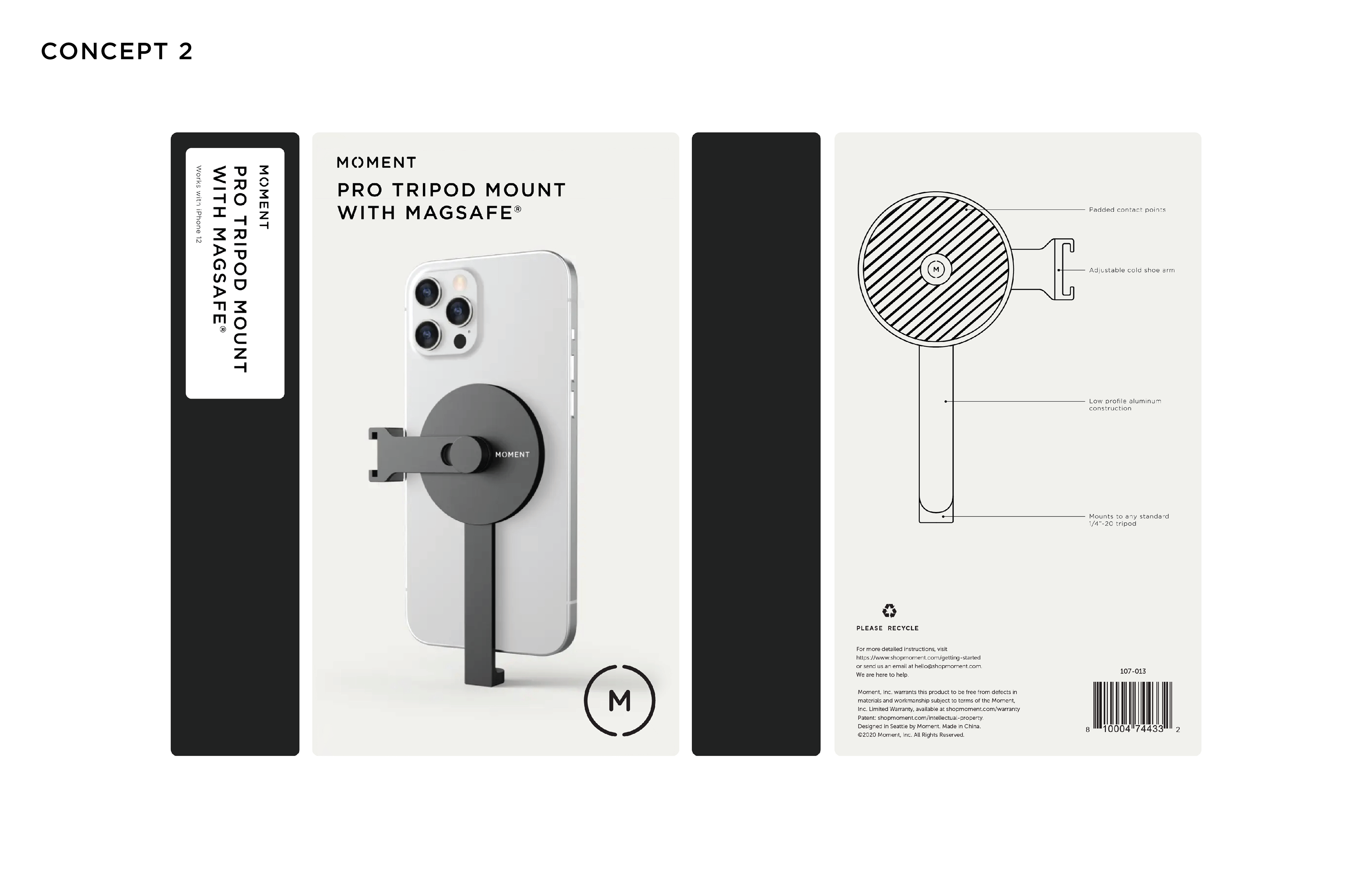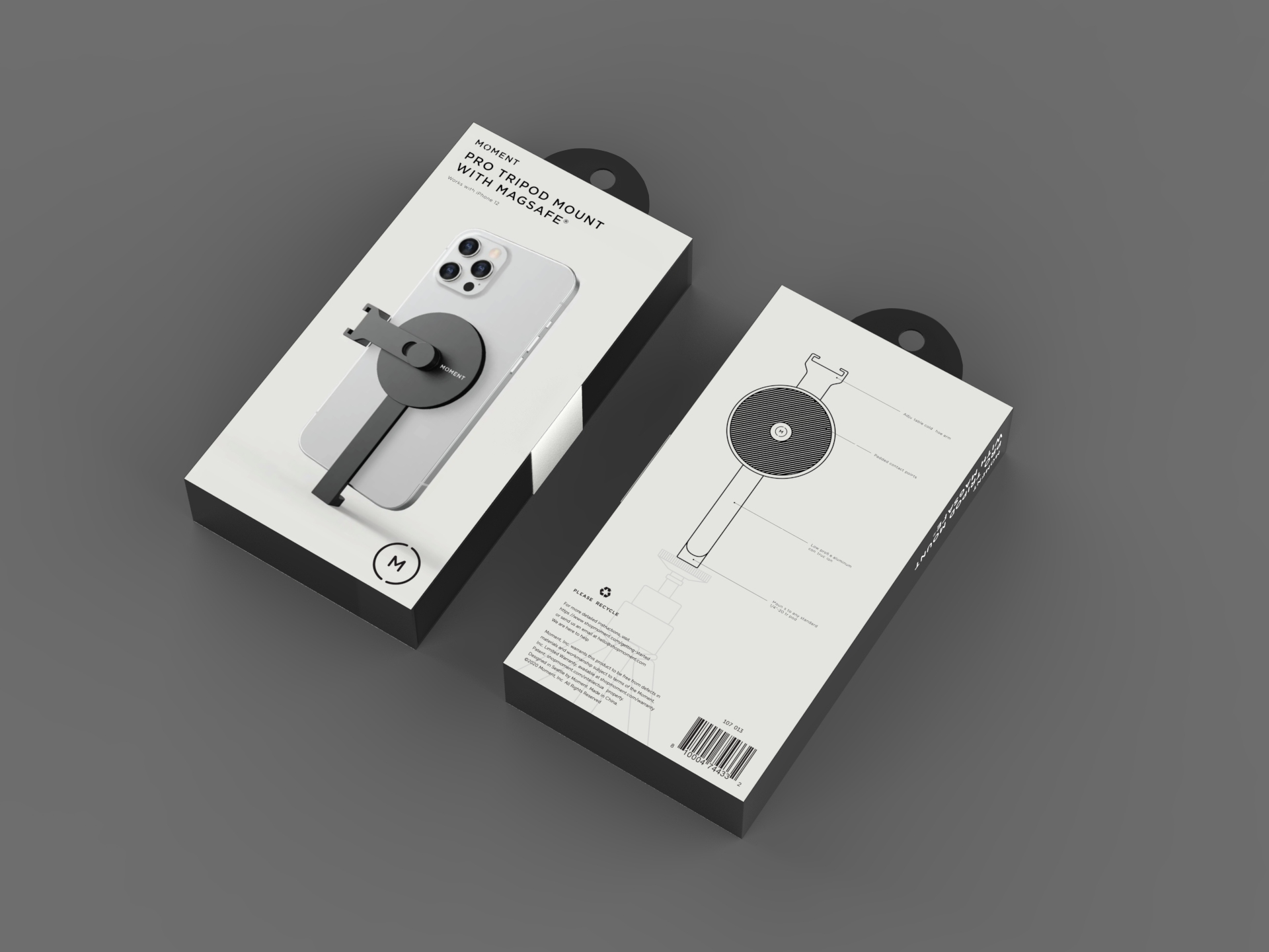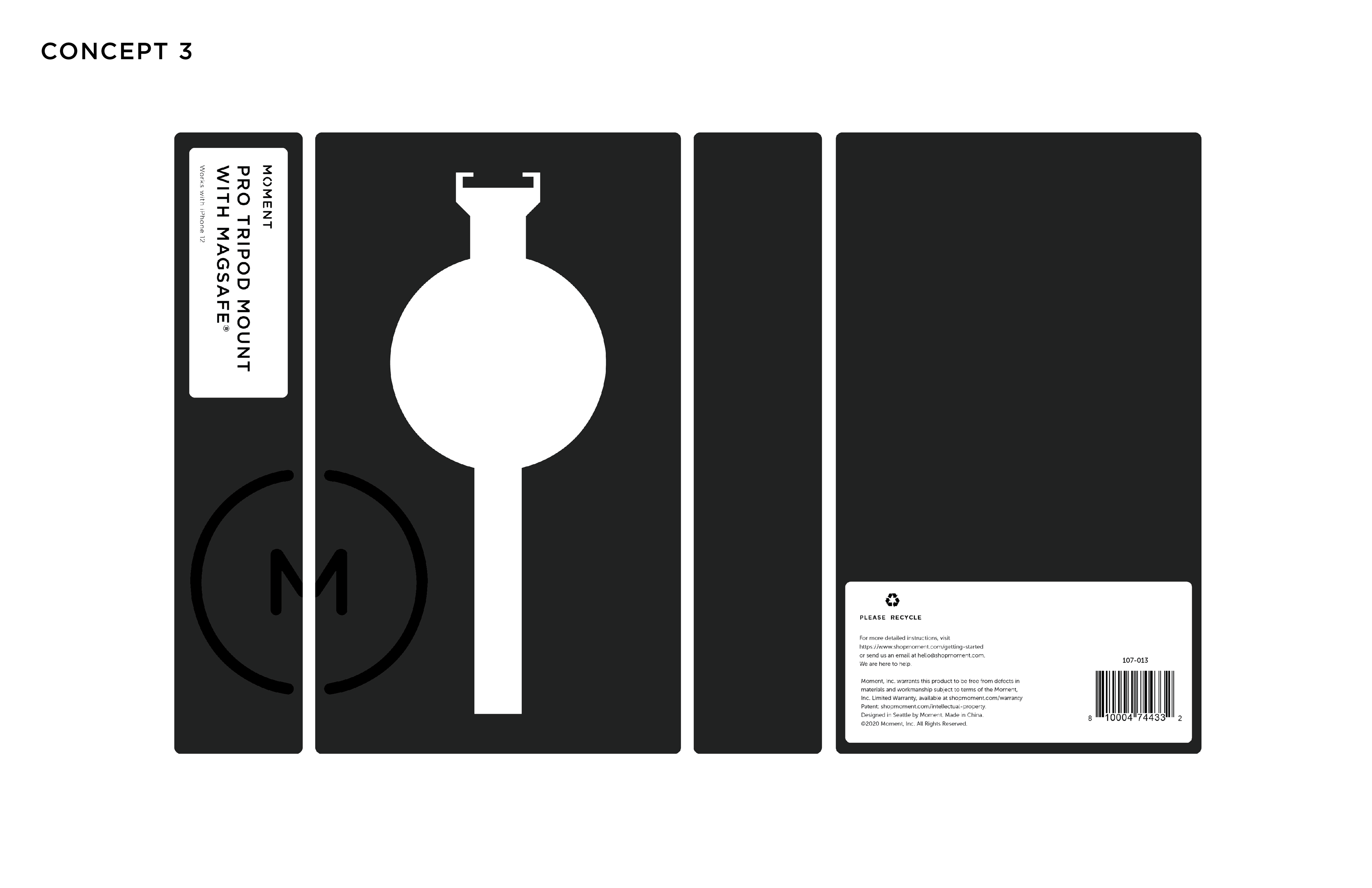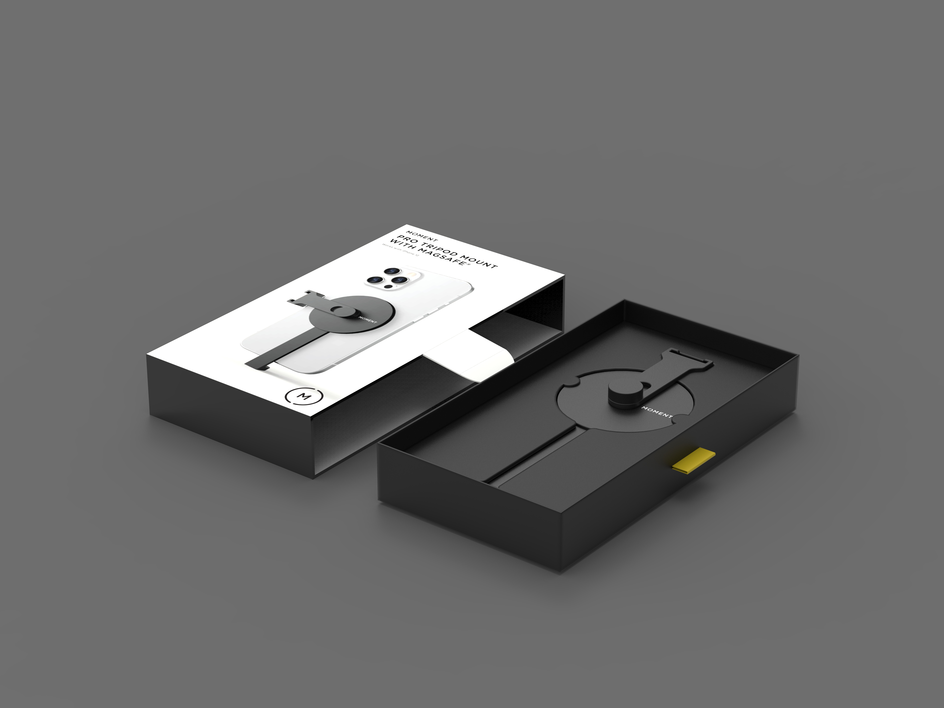 SUMMARY This was a short contract project for a packaging design for Moment's MagSafe Pro Tripod Mount. The main objectives were to keep packaging as minimal and sustainable as possible while using a single material.